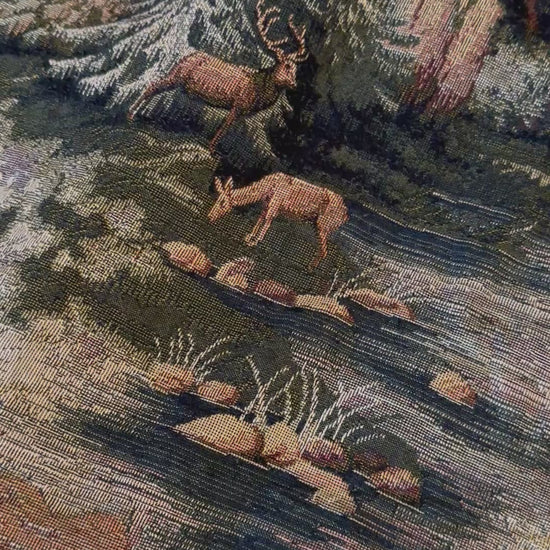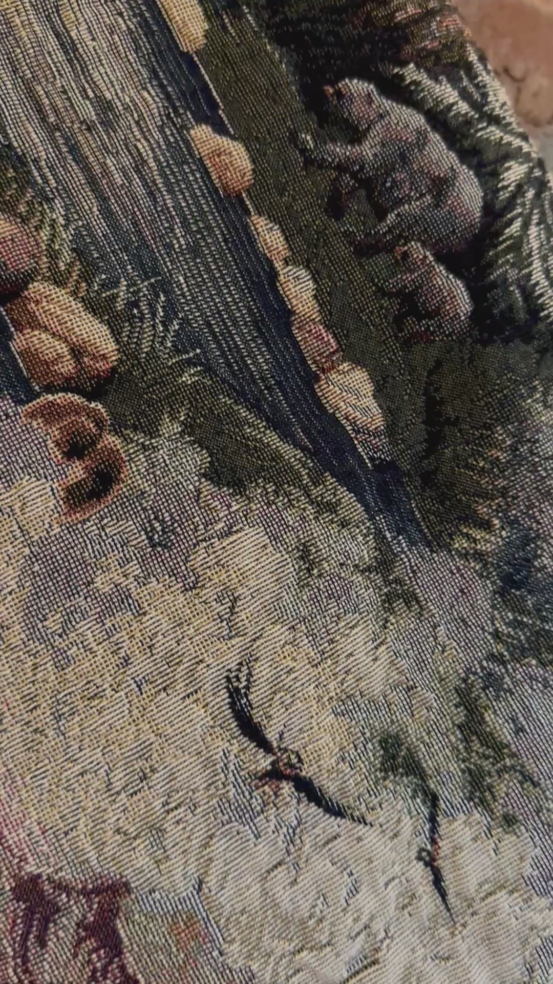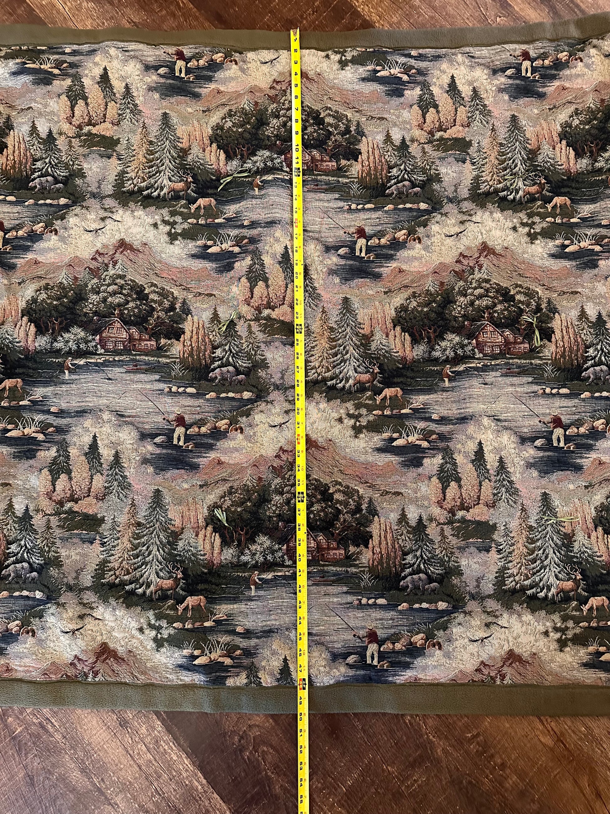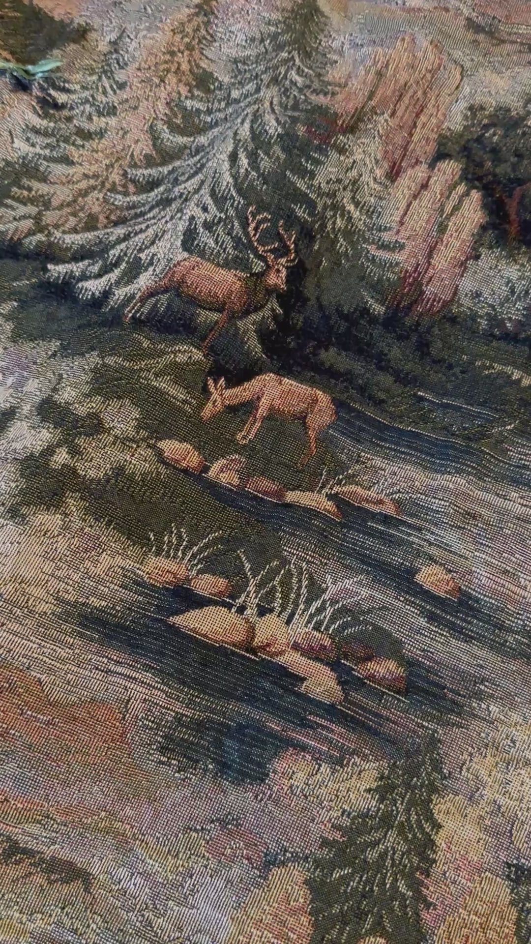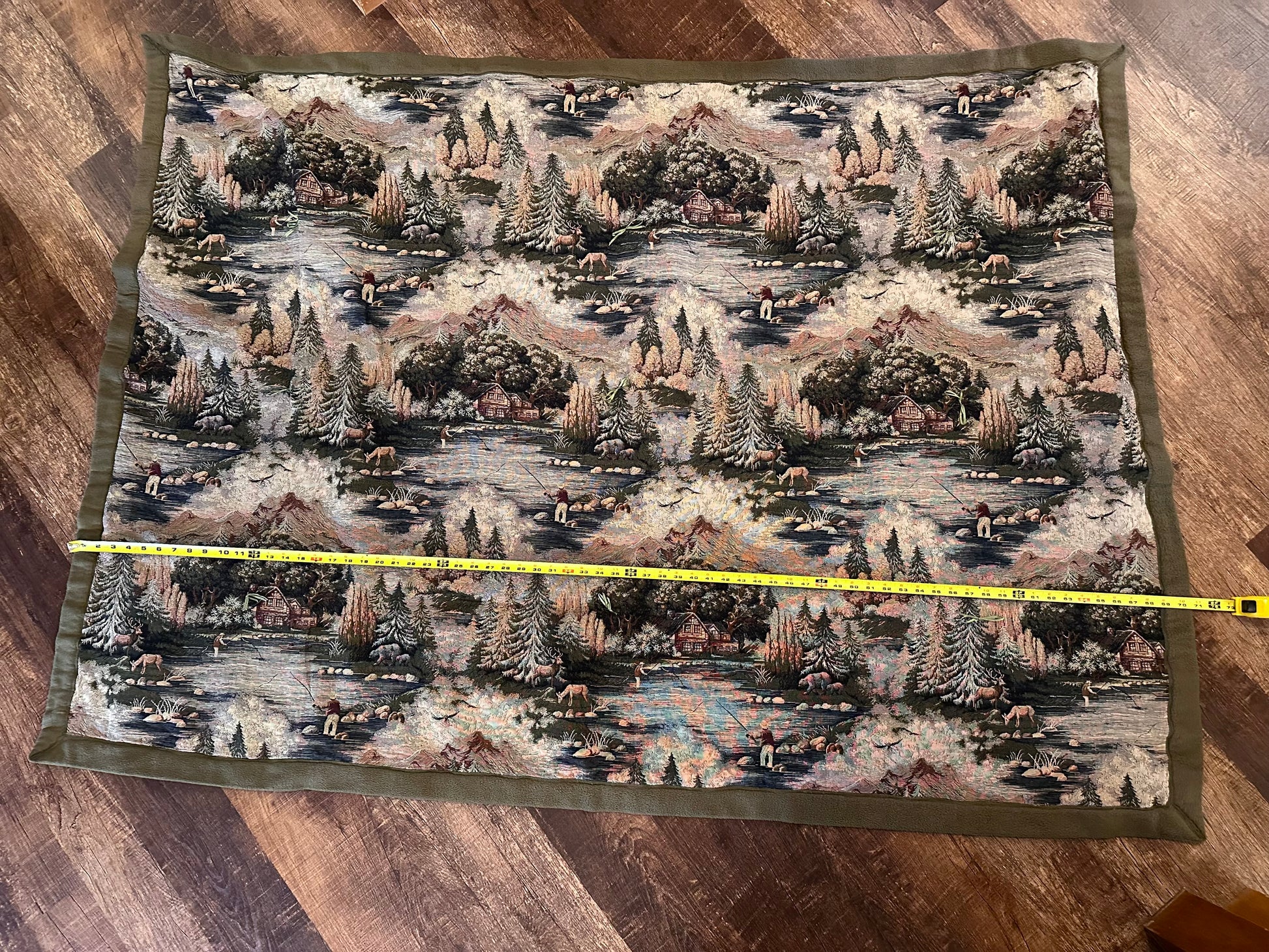 This vintage tapestry blanket is heavy and great quality! With olive green fleece backing and green bows subtly sewn across three rows. A great size of 70”x50” will look great in your living area and plenty of room to cozy up!