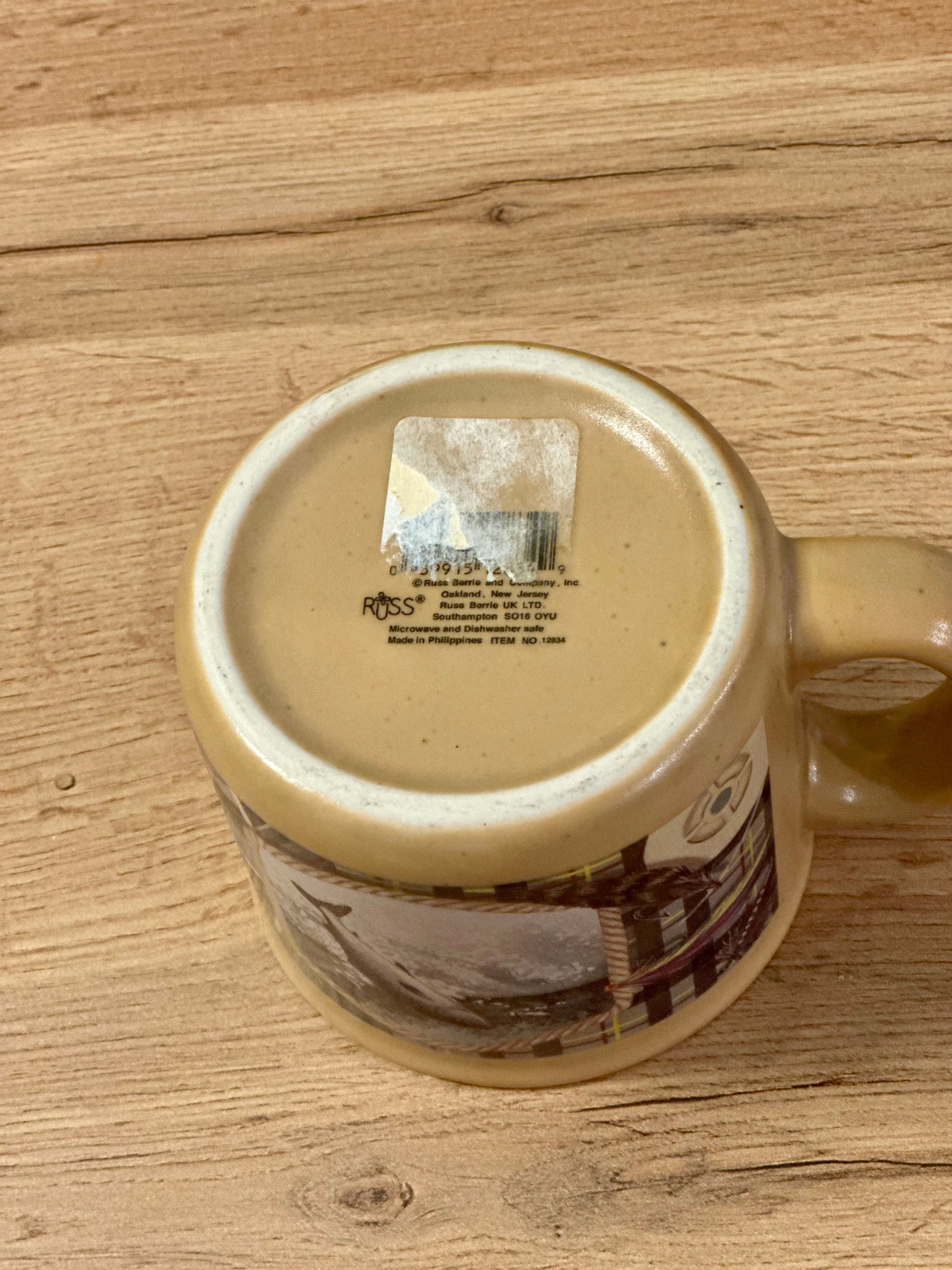 Real vintage charm with this tan mug showing many different prints and fish scenes! Original Russ Berrie location made in late 60s early 70s!
