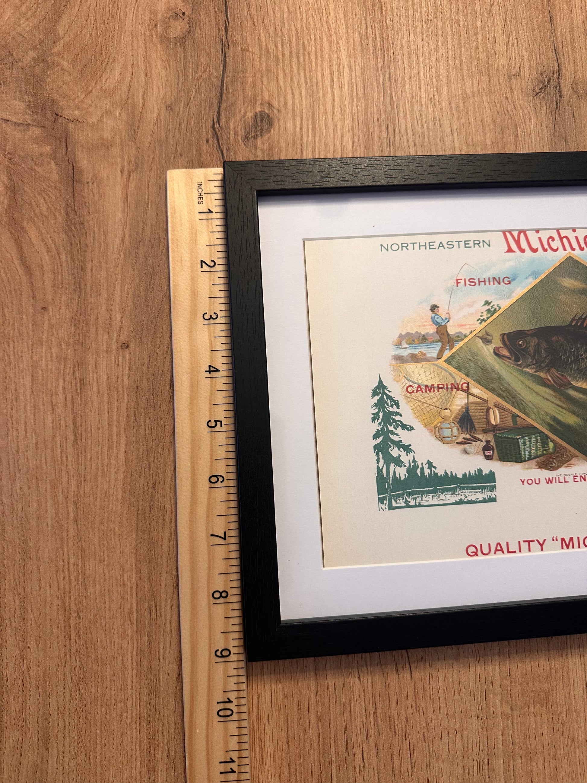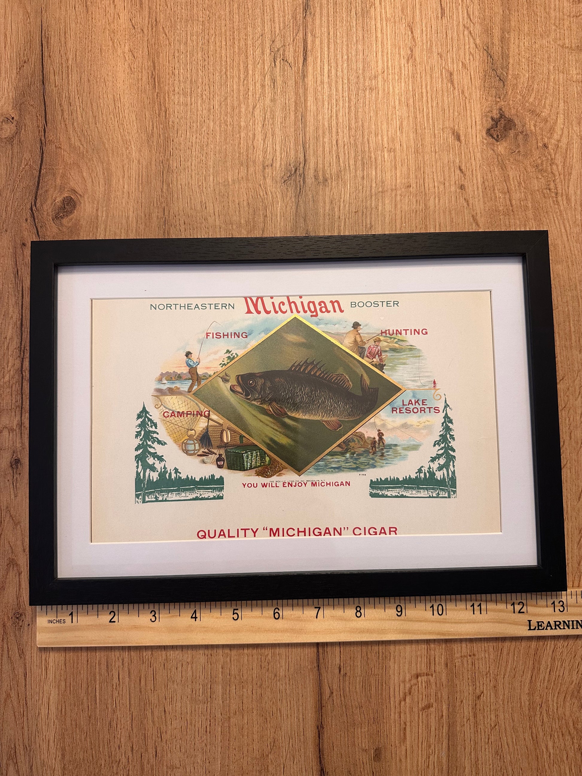 Framed rare Michigan cigar box label with gold accents. A very unique item for your fly tying set up or man cave