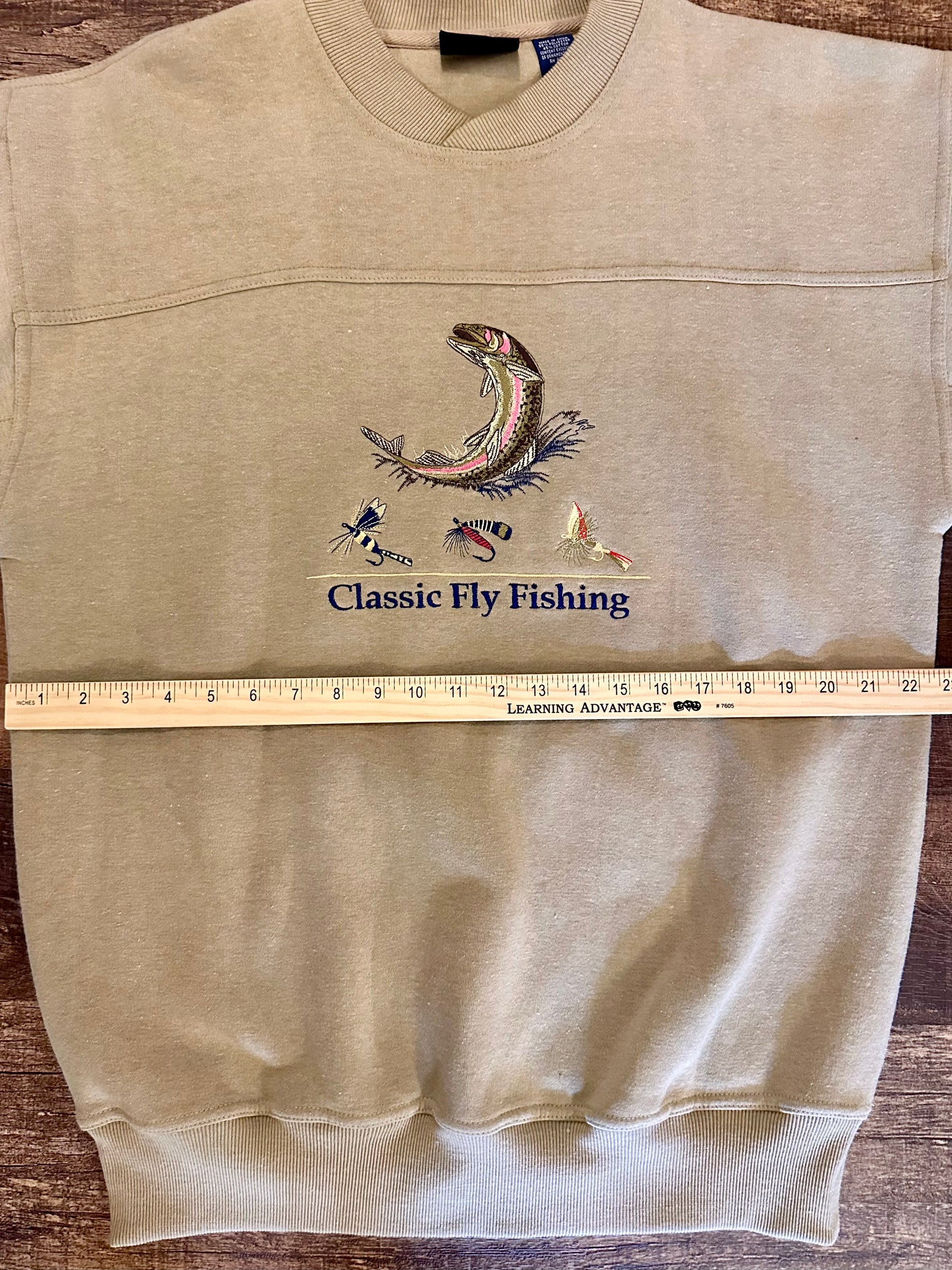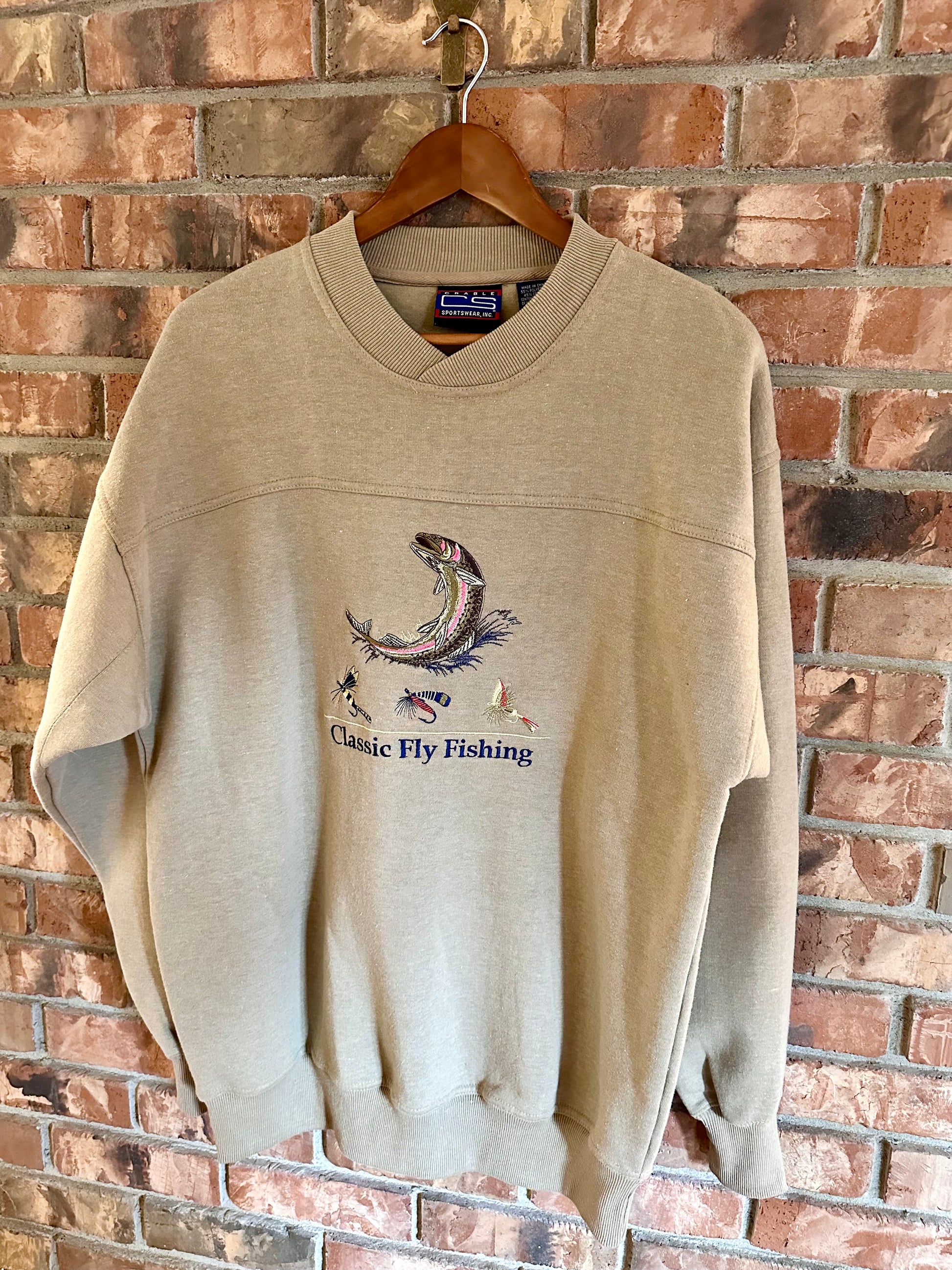 Vintage Crable Sportswear Sweatshirt (L) Embroidered Classic Fly Fishing Trout and Fly Beige