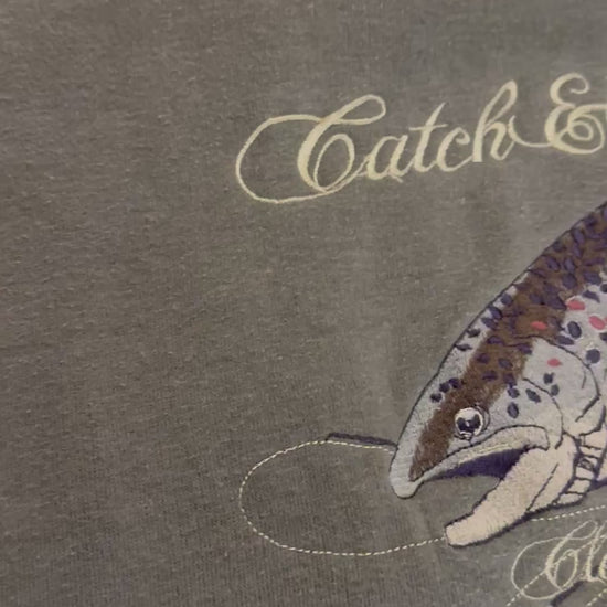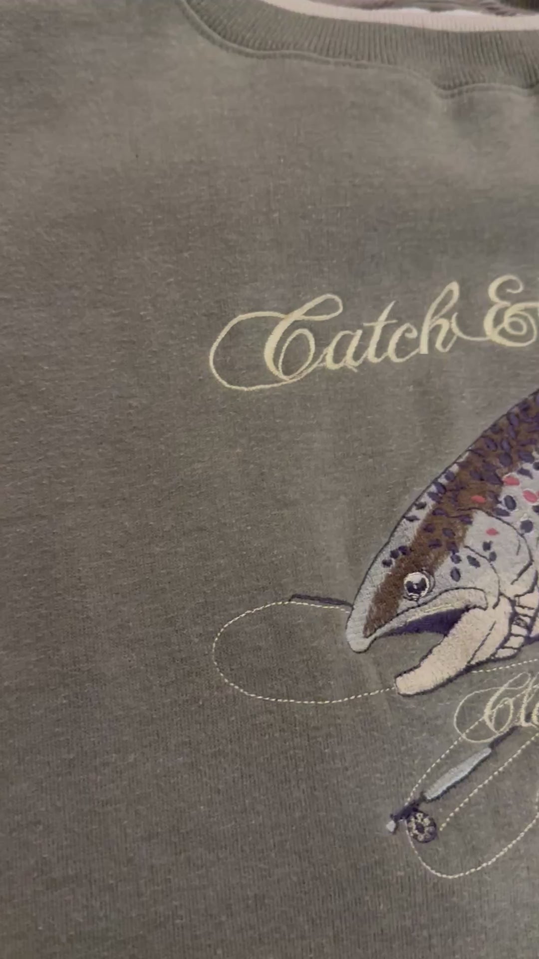 Vintage Danaggers “Catch and Release” Sweatshirt (L) Embroidered Brown Trout - Olive Green