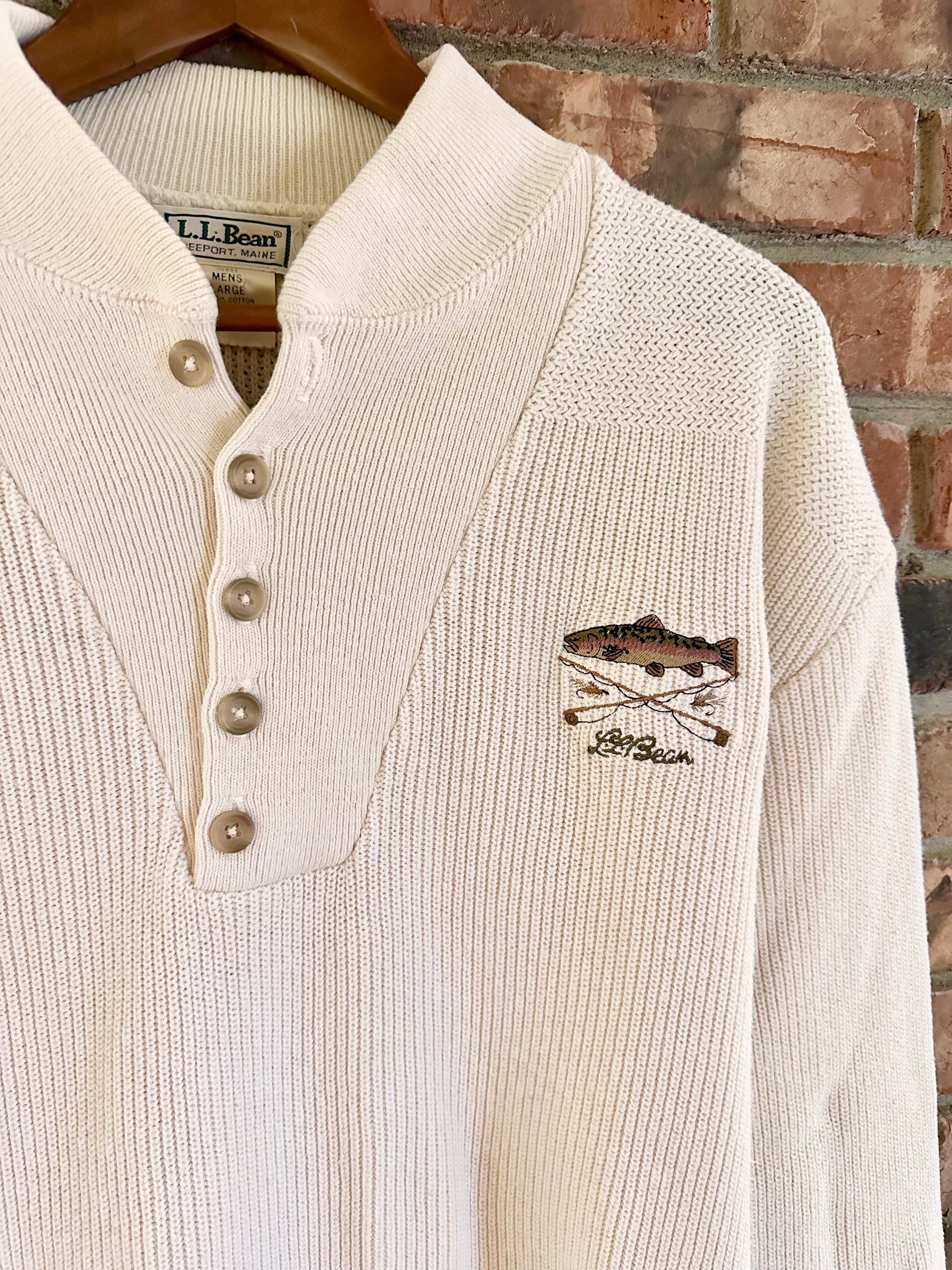Vintage L.L. Bean Henley Sweater (L) Embroidered Trout & Fly Rods Cream White