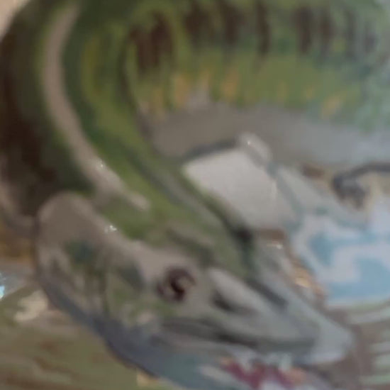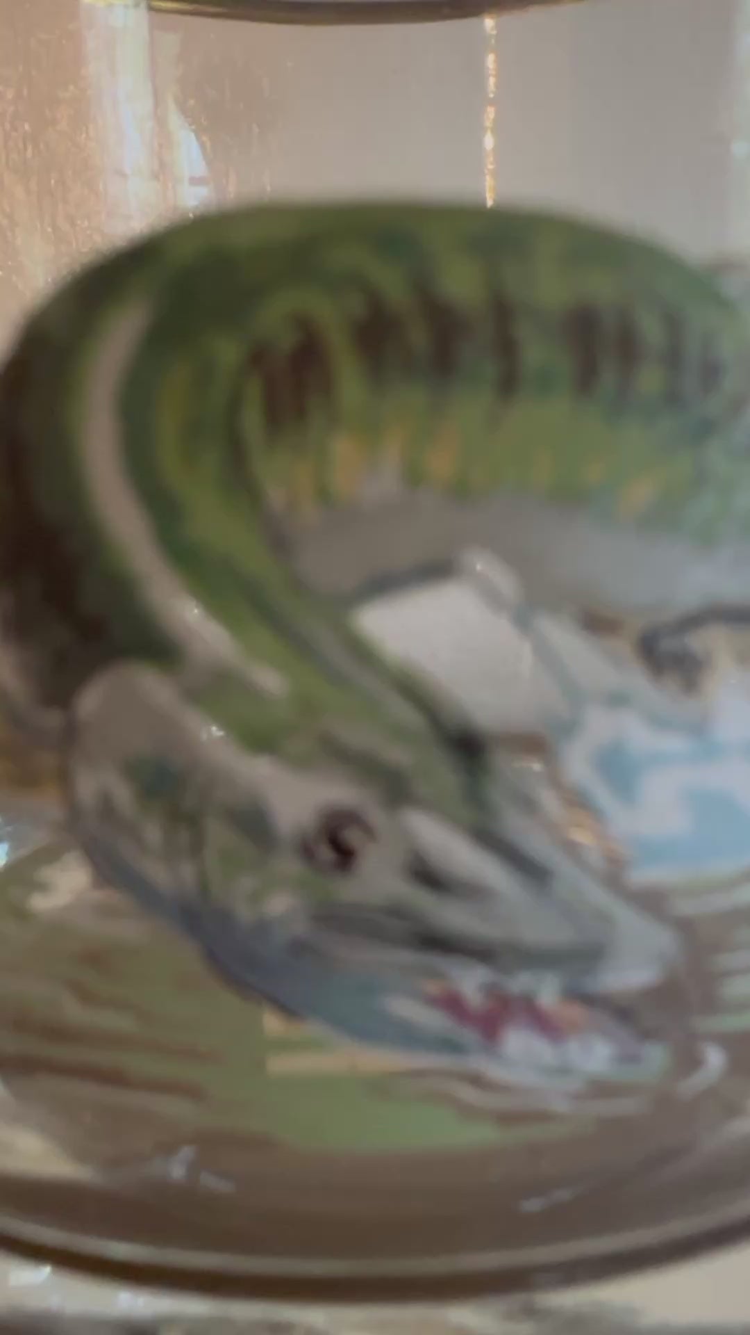 The celebrated artist Ned Smith with beautiful hand painted mint condition whiskey glasses with gold lip rims! Impress your guests with these monsters in the deep! Original sales tags on bottom!