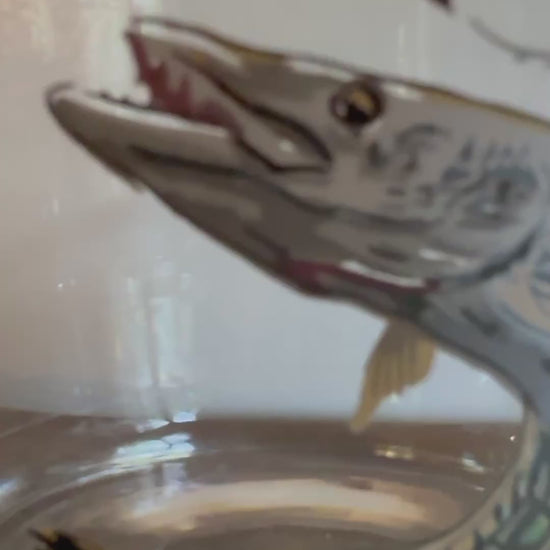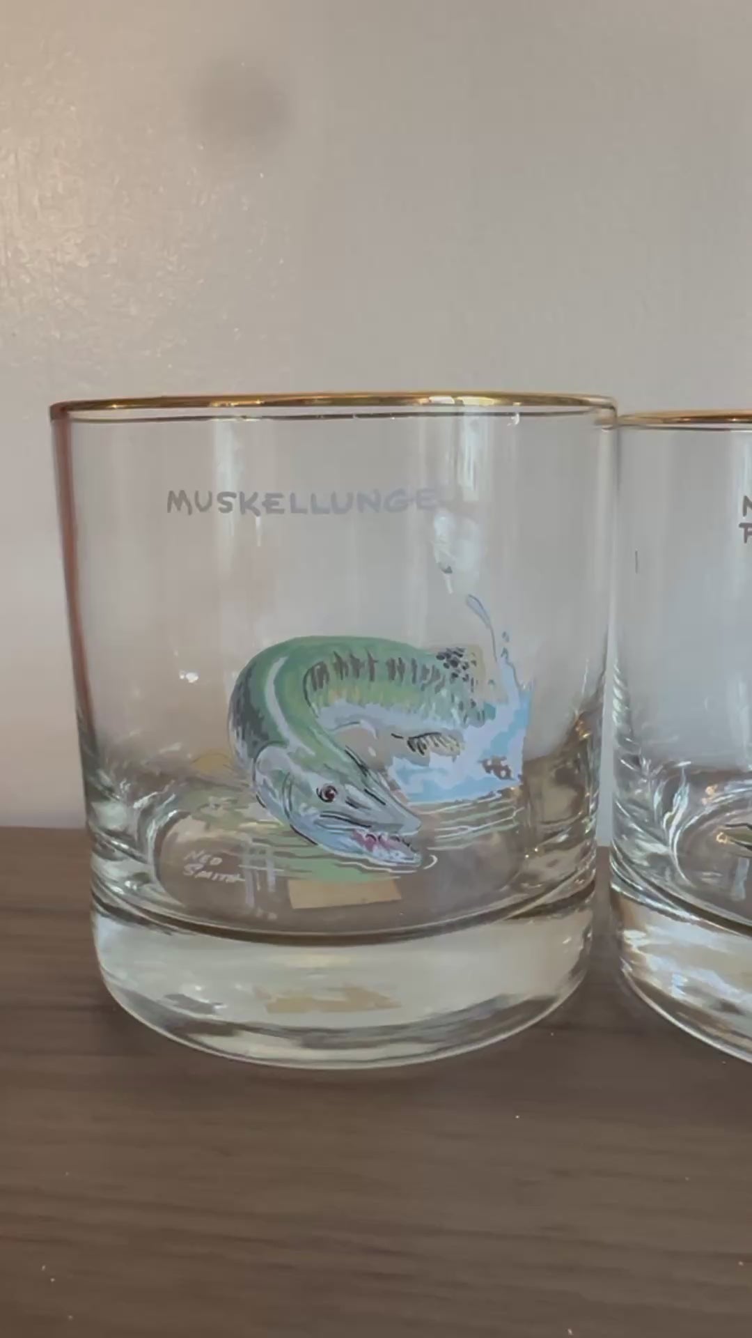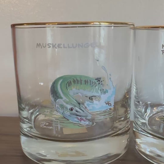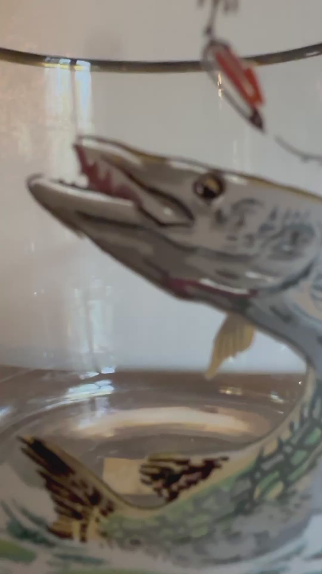 Vintage 1970s MINT Ned Smith Whiskey Glasses - Muskie and Pike Lowballers (Set of 2)