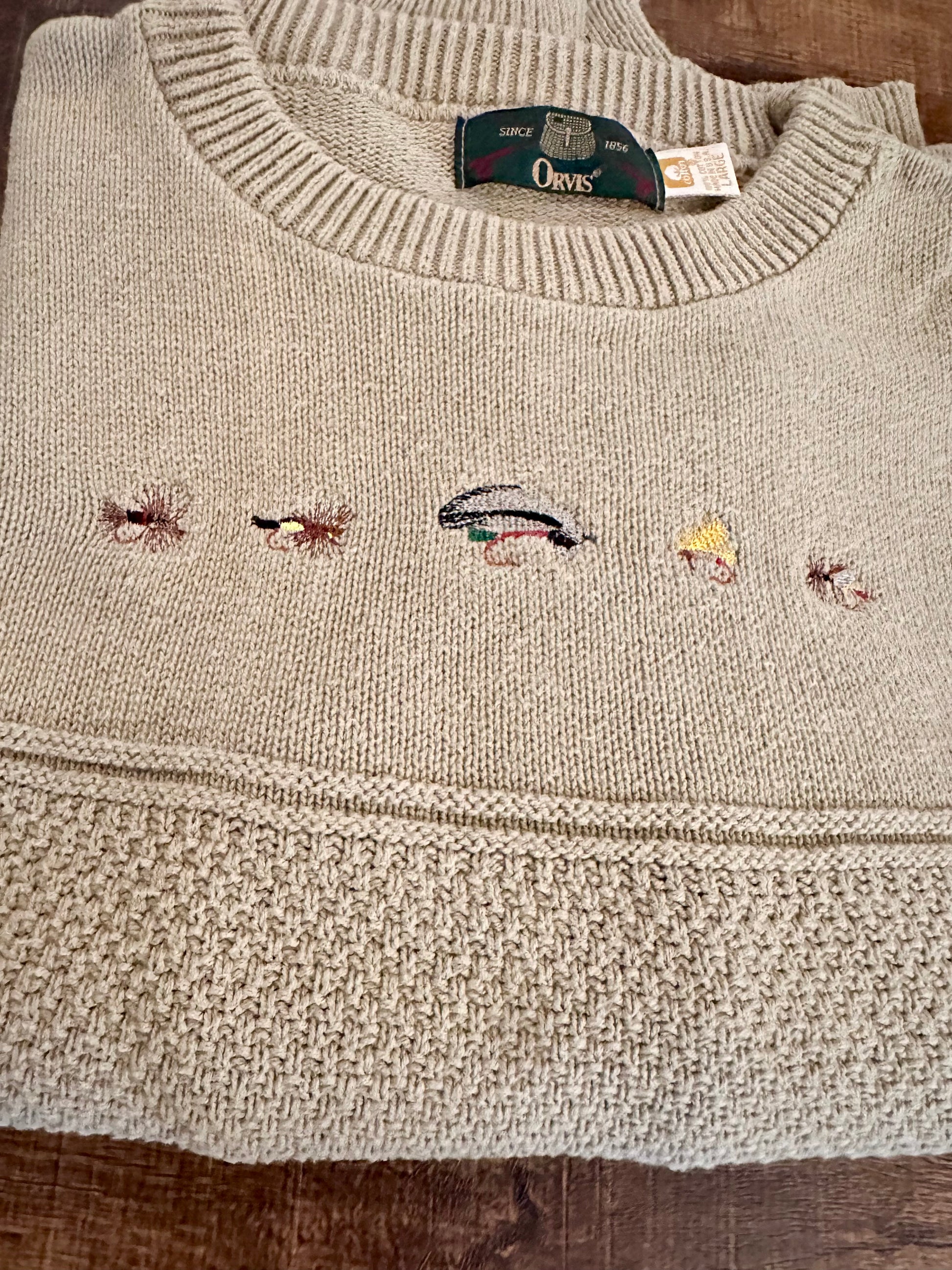 Vintage Orvis Sweater (L) Embroidered Fly Beige Tan