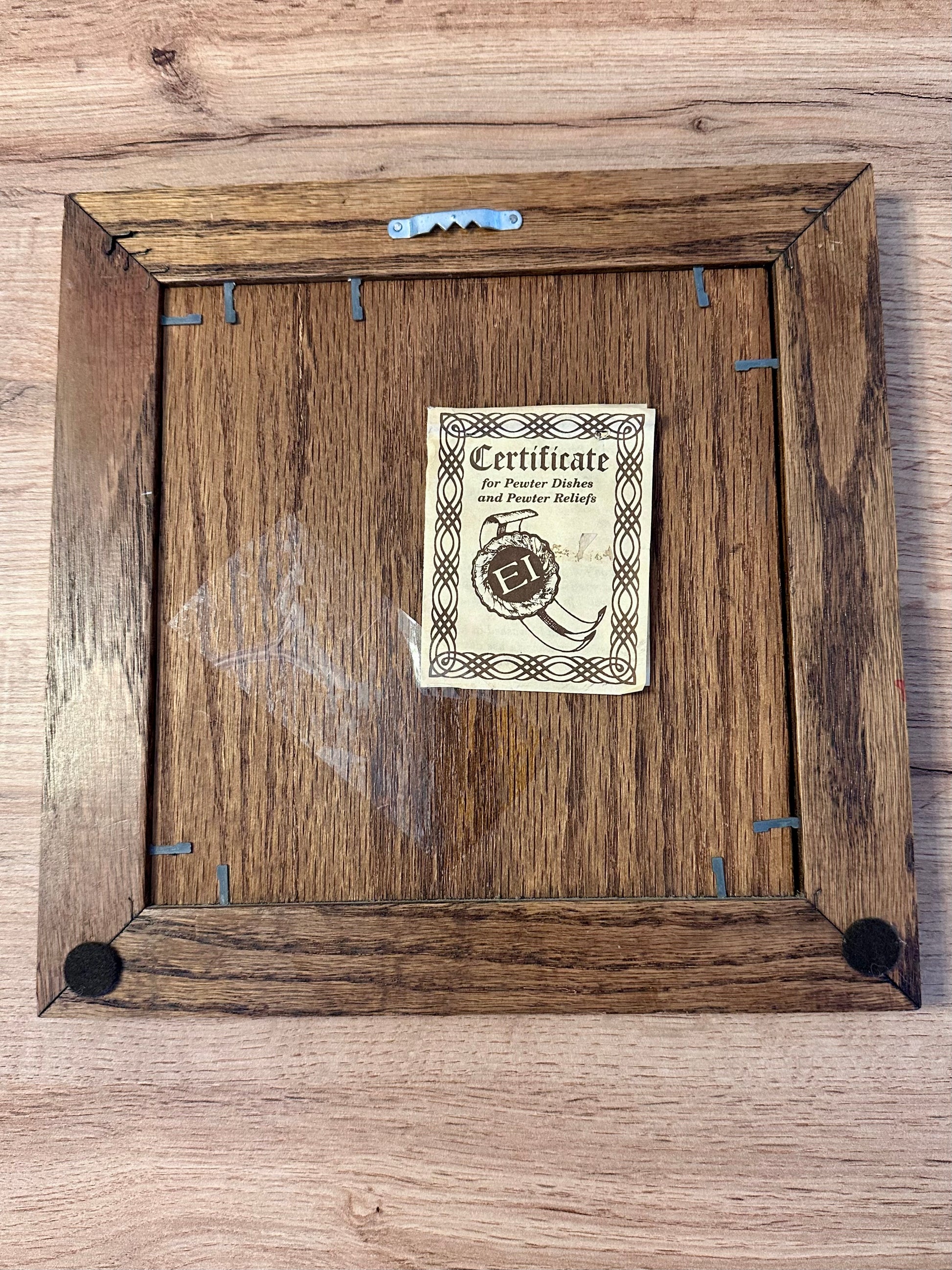 Vintage Pewter Relief Art Plate Mounted on Wood Frame - Fly Fishing Scene